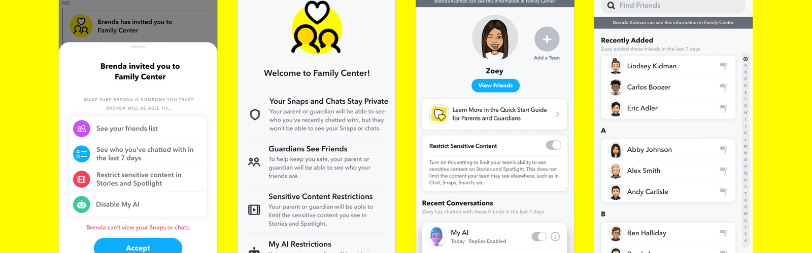 Para proteger a sus usuarios más jóvenes y fomentar el uso saludable de las plataformas de comunicación en línea, Snapchat comparte información importante sobre algunas de las herramientas y funcionalidades disponibles a través de sus controles parentales también conocidos como ‘Centro Familiar’. A través de estas herramientas, los padres tienen acceso a la lista de amigos de sus hijos o a quienes han enviado un mensaje, foto o video en los últimos 7 días, esto con el fin de saber con quiénes se comunican y si son personas de confianza o conocidas.
